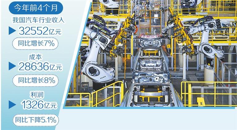 不过,行业增收不增利。国家统计局数据表明,今年前4个月,我国汽车行业收入32552亿元,同比增长7%;成本28636亿元,同比增长8%;利润1326亿元,同比下降5.1%;汽车行业利润率降至4.1%。