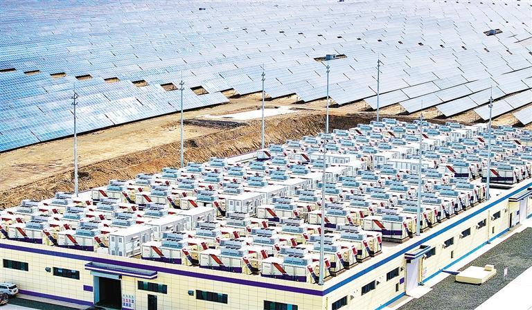 近日,在甘肃省张掖市山丹县东乐北滩百万千瓦级光伏发电基地,一排排整齐的大型“充电宝”矗立在光伏集阵中,为电网稳定运行注入新动力。截至目前,该县建成新能源发电站12个,新能源总装机容量达104.8万千瓦。殷 旭摄(中经视觉)