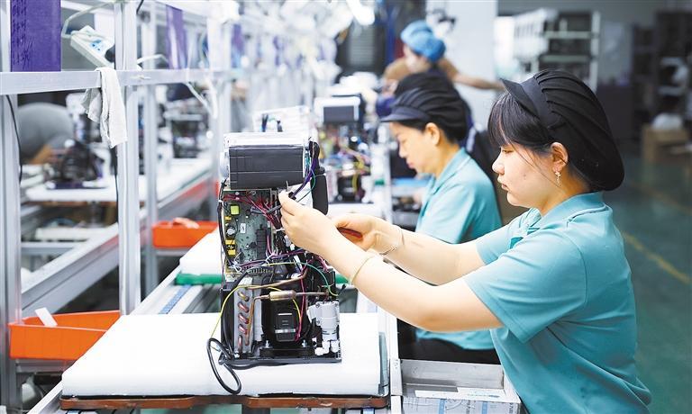 位于浙江慈溪的宁波鼎安电器有限公司车间内,工人在流水线上装配饮水机。该企业专业生产包含净化、加热、制冷、制冰等核心功能的净饮水器产品,已形成年产60万台整机设备及400万支滤芯的智造能力。