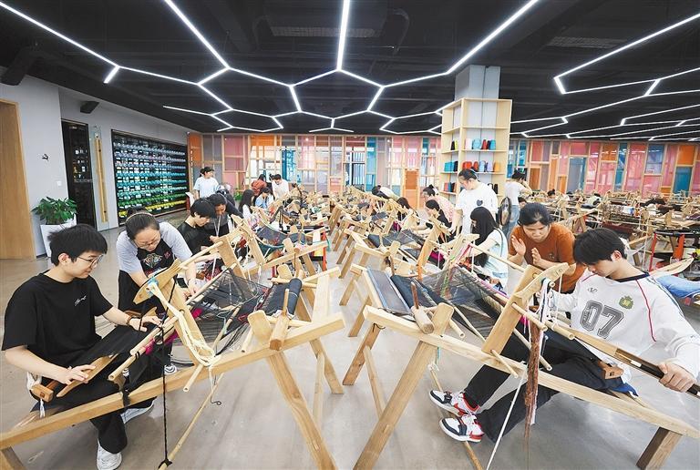 湖南省张家界市依托当地土家族织锦文化创意园推出特色非遗主题游览路线,在保护和传承民间工艺的基础上,进一步丰富旅游业态,提升旅游内涵。图为大学生在乖幺妹土家族织锦文化创意园研学体验。吴勇兵摄(新华社发)
