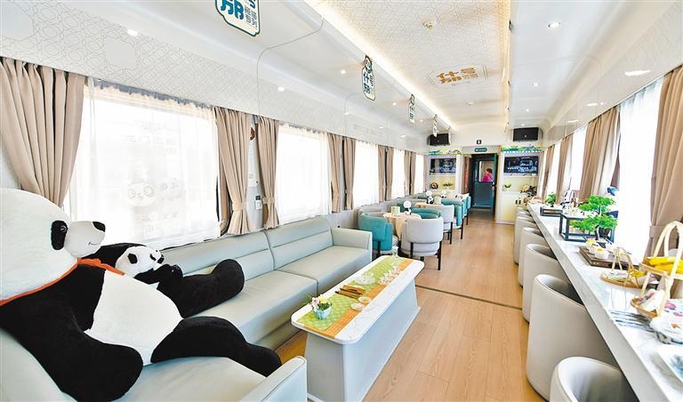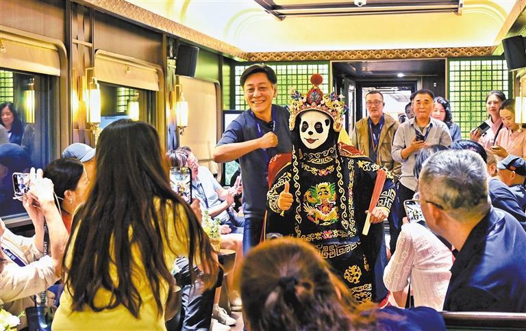 装饰着金色线条的宝蓝色车身十分醒目,整车以“流动的艺术画廊”为载体,陈列蜀锦、蜀绣、竹编等7大类近60件国家级非遗臻品,让游客在列车上零距离感受天府非遗的魅力。特色服务更是让人惊喜连连。列车配备了“熊猫管家”、“度假大使”、专业厨师及后勤保障人员,为游客提供24小时高品质服务。