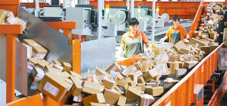 6月18日,江西省吉安市永丰县电子商务进农村综合示范点申通快递公司物流分拣中心,工作人员正在配合智能分拣设备,对“6·18”网购节消费者购买的大量快递包裹进行装卸、分拣、运送。