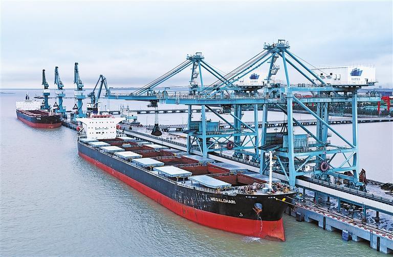 6月25日,货轮在浙江省温州港乐清湾港区煤炭码头卸运电煤。进入“迎峰度夏”电煤保供时期,乐清湾港区加大煤炭运输组织力度,开通电煤“绿色通道”,实现随到随卸、及时转运,确保电厂发电用煤需求。蔡宽元摄(中经视觉)