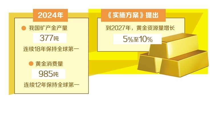 工业和信息化部等9部门日前印发《黄金产业高质量发展实施方案(2025—2027年)》(以下简称《实施方案》),提出到2027年,黄金资源保障能力和产业链创新水平明显提升。其中,在资源保障方面,黄金资源量增长5%至10%,黄金、白银产量增长5%以上。到2035年,高质量发展格局全面形成,资源综合保障能力明显增强,建成全球领先的技术体系和产业体系。