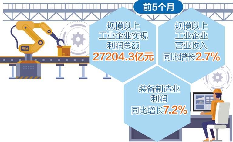 工业经济转型升级持续推进,装备制造业效益保持较高水平,前5个月,装备制造业利润同比增长7.2%,拉动全部规模以上工业利润增长2.4个百分点,对规模以上工业利润支撑作用突出。从行业看,装备制造业的8个行业中,有7个行业利润实现增长,其中,电子、电气机械、通用设备等行业利润增长超过两位数,增速分别达11.9%、11.6%、10.6%。