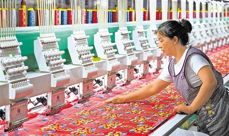 在曹县昌顺绣花公司,工作人员查看正在绣制的布料。山东省菏泽市曹县共有汉服企业2750多家,网店约1.5万个,汉服从业者近10万人,汉服产业年销售额在120亿元左右,以马面裙为主的汉服销往澳大利亚、加拿大、欧盟等10余个国家和地区。新华社记者 徐嘉懿摄