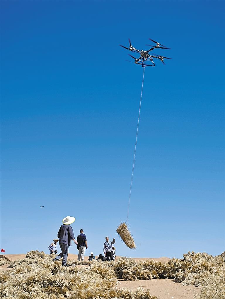 6月30日,治沙工人在位于宁夏中卫市长流水村的腾格里沙漠东南缘利用无人机吊运草料。当日,这项跨越半个世纪的治沙工程,在腾格里沙漠宁夏境内实现全面“锁定”。工程全线贯通后,将在黄河上游筑起一道重要生态屏障。新华社记者 王 鹏摄