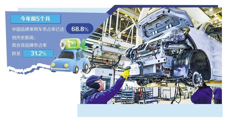 电动化与智能化变革浪潮,不仅在加速汽车产品进化,也在深刻重构市场竞争格局。中汽协数据显示,今年前5个月,中国品牌乘用车市占率已达68.8%,创历史新高;而合资品牌市占率跌至31.2%,创出新低。
