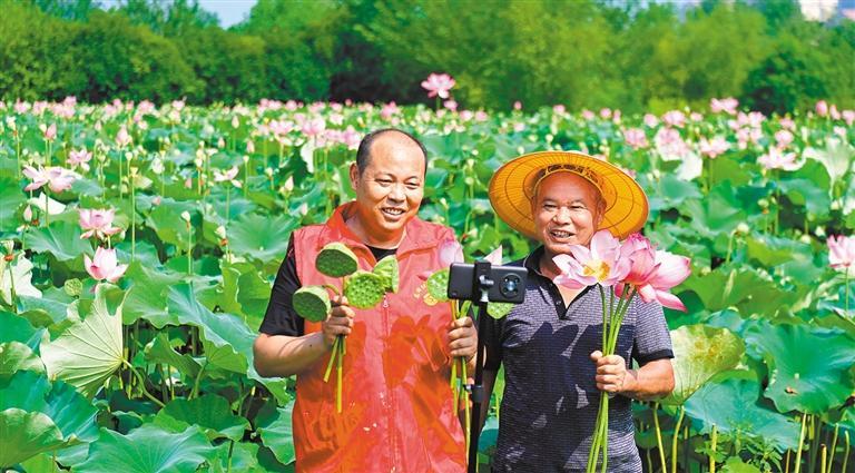 ▼6月26日,江西省宜春市万载县猛辉村党员协助村民直播推介荷花莲蓬。