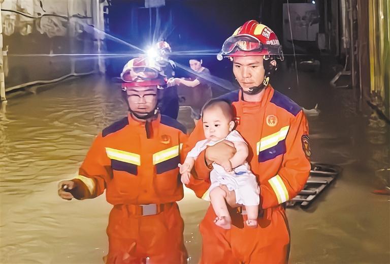 ◀近日,贵州省榕江县遭遇严重洪涝灾害,目前抗洪救灾工作正有序推进。这是6月25日晚,国家隧道应急救援中铁五局贵阳队党员在转移群众。