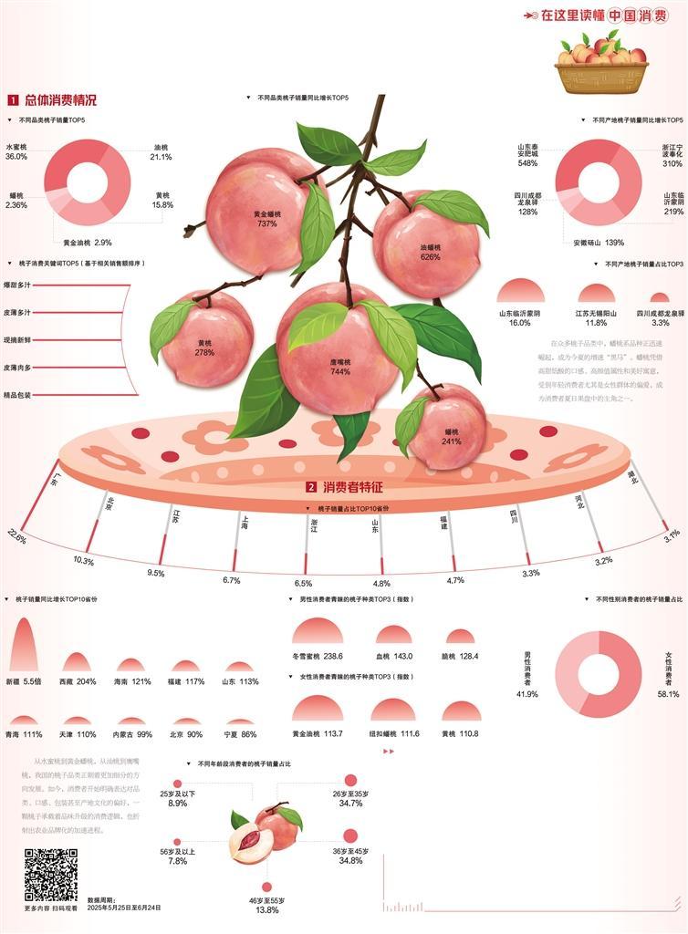 进入盛夏,随着桃子主产区陆续进入采摘高峰期,市场消费也快速升温。数据显示,桃子整体销售热度走高,水蜜桃、油桃、黄桃成为销量占比前三名的品类,鹰嘴桃、黄金蟠桃等品种则展现出强劲增长势头,同比增速均超7倍。