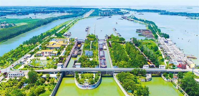 7月9日,苏北运河宿迁市皂河段,船舶在航道上有序航行。今年前6月,苏北运河10个梯级船闸开放14.73万次,放行55.12万艘次,船舶通过量达11.03亿吨。徐 瑞摄(中经视觉)
