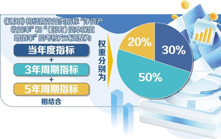 具体来看,《通知》将此前规定中经营效益类指标的“净资产收益率”由“3年周期指标+当年度指标”相结合的考核方式调整为“当年度指标+3年周期指标+5年周期指标”相结合的考核方式,权重分别为30%、50%、20%。同时,将经营效益类指标的“(国有)资本保值增值率”由“当年度指标”调整为“当年度指标+3年周期指标+5年周期指标”相结合的考核方式,权重同样分别为30%、50%、20%。