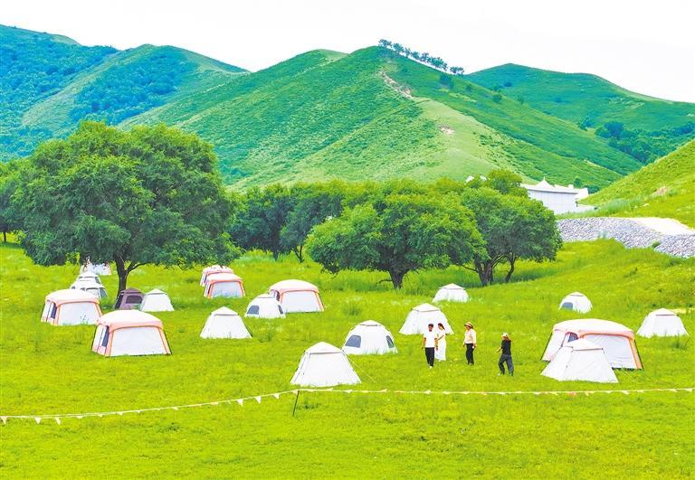 7月8日,游客在内蒙古自治区兴安盟科尔沁右翼前旗的乌兰毛都草原牧场露营区游玩。近年来,当地依托独特的原生态山地草原地貌、清凉宜人的气候条件和丰富的游牧文化资源,持续发展夏季避暑特色旅游,吸引游客前来休闲避暑、观光度假。 王 正摄(中经视觉)