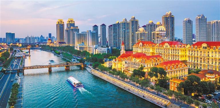 7月10日,天津市海河两岸灯光璀璨。近年来,当地加速推进美丽河湖建设,提升城市生态宜居水平。