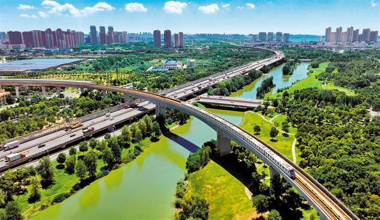 7月3日,湖北省武汉市首条全自动运行轨道交通线,列车驶过黄家湖大学城。
