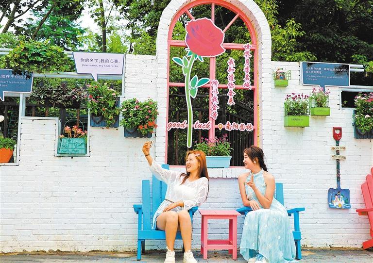 6月25日,市民在河南省南阳市滨河路一处改造后的景观点拍照。