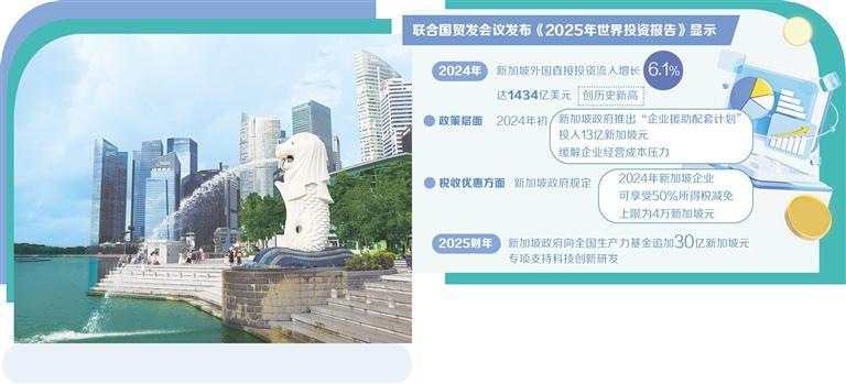 联合国贸易和发展会议日前发布《2025年世界投资报告》显示,2024年,新加坡外国直接投资流入增长6.1%,达1434亿美元,创历史新高。作为单个国家经济体,其全球排名从2022年的第三位升至第二位,在东盟成员中继续领跑。