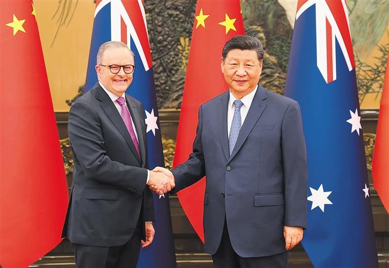 阿尔巴尼斯表示,近年来,澳中关系取得积极进展。澳方十分珍视对华关系,期待同中方一道,平等相待,求同存异,互利合作,推动澳中关系发展,这符合两国的共同利益,也有利于地区稳定繁荣。澳方坚持一个中国政策,不支持“台独”。澳方愿与中方保持各层级交往对话,增进互信。中国的发展对澳大利亚至关重要,澳方从不寻求与中国经济脱钩,愿保持双边贸易畅通,推进绿色产业、应对气候变化、医疗技术等领域务实合作,实现互利共赢。愿加强旅游、教育、体育等人文交流,促进人民相互理解。面对变乱交织的世界,澳方愿与中方坚持多边主义,支持联合国发挥重要作用,共同维护自由贸易和世界贸易组织规则,为国际社会提供更多稳定性、确定性。澳方支持中国担任2026年亚太经合组织东道主。