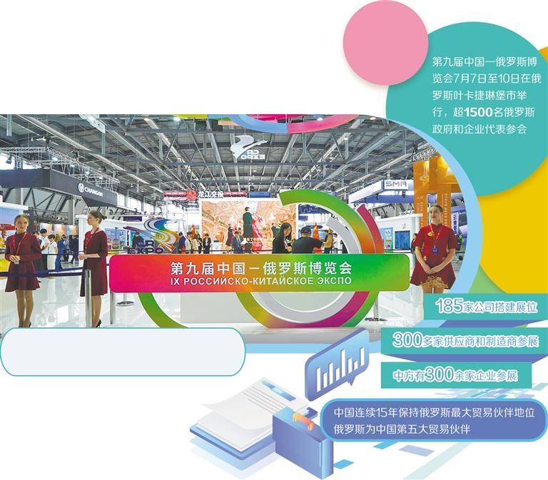 第九届中国—俄罗斯博览会7月7日至10日在俄罗斯叶卡捷琳堡市举行。本届博览会以“中俄务实合作稳健前行”为主题,超过1500名俄罗斯政府和企业代表报名参会,185家公司搭建展位,300多家供应商和制造商参展。中方也有300余家企业参展,聚焦高端制造、能源合作、科技创新等领域。