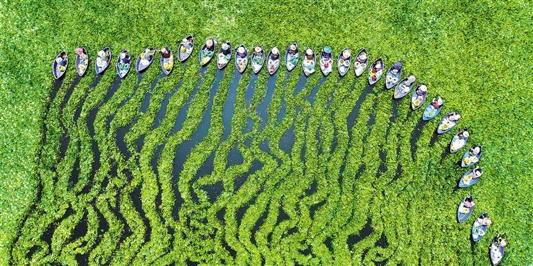 7月15日,江西省新余市分宜县源盛农业开发中心菱角种植基地,工人在采收菱角。近年来,分宜县因地制宜发展菱角、莲藕等水上特色种植业,依托“水上经济”推动乡村振兴,助力农民增收。