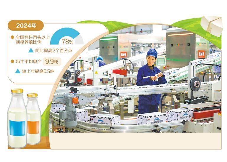 “2024年,全国存栏百头以上规模养殖比例达78%,同比提高2个百分点;奶牛平均单产9.9吨,较上年提高0.5吨;规模牧场99%以上配备全混合日粮搅拌车,原料奶生产100%实现机械化挤奶。”中国奶业协会副会长兼秘书长刘亚清说,奶业处于转型升级关键期,产能随市场需求小幅缩减,规模化养殖比例进一步提升,产业综合素质持续增强,乳品质量保持较高水平。