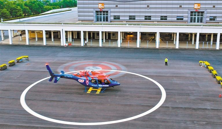 7月16日,江苏昆山,一架贝尔429直升机载着首批体验乘客,从昆山城市航站楼升空,飞向上海杨浦滨江。这条航线将串联起昆山、上海市中心和浦东国际机场航空枢纽,形成立体交通体系。该航线预计于8月18日正式投入商业化运营。袁新宇摄(中经视觉)