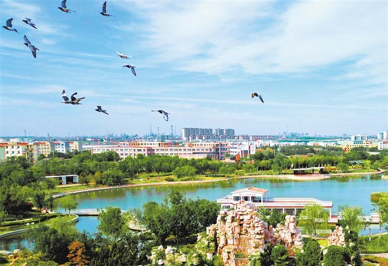 5月15日,山东省东营市,鸟儿在钻井公园上空自由飞翔。该市通过建设口袋公园、城市绿道等,让市民共享“绿色福祉”。刘智峰摄(中经视觉)