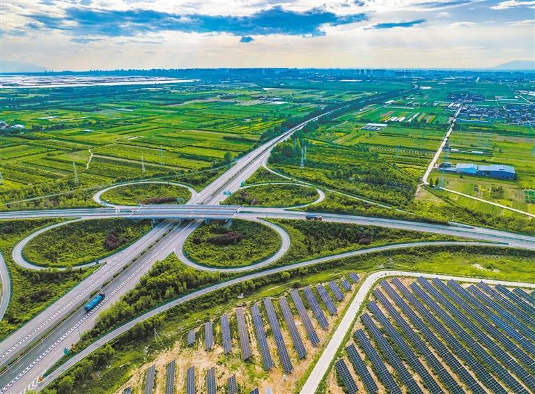 7月1日,山西省运城市盐湖区,一处光伏发电站与东郭高速互通枢纽、蓝天白云相映成景。