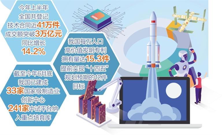 科技成果转化规模不断壮大。上半年,全国共登记技术合同近41万件,成交额突破3万亿元,同比增长14.2%。产业创新平台建设持续推进,截至6月底,我国已建成33家国家级制造业创新中心,241家中试平台纳入重点培育库,为成果产业化提供了坚实支撑。我国每万人口高价值发明专利拥有量已经达到15.3件,提前实现“十四五”规划预期的12件目标。