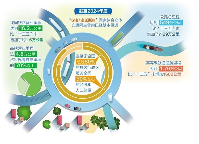 ——“大通道”加快贯通。“十四五”期间,加快推进出疆入藏、沿江沿海沿边、西部陆海新通道等战略骨干通道建设,“6轴7廊8通道”国家综合立体交通网主骨架已经基本贯通,连接了全国超过80%的县级行政区,服务全国90%左右的经济和人口总量。