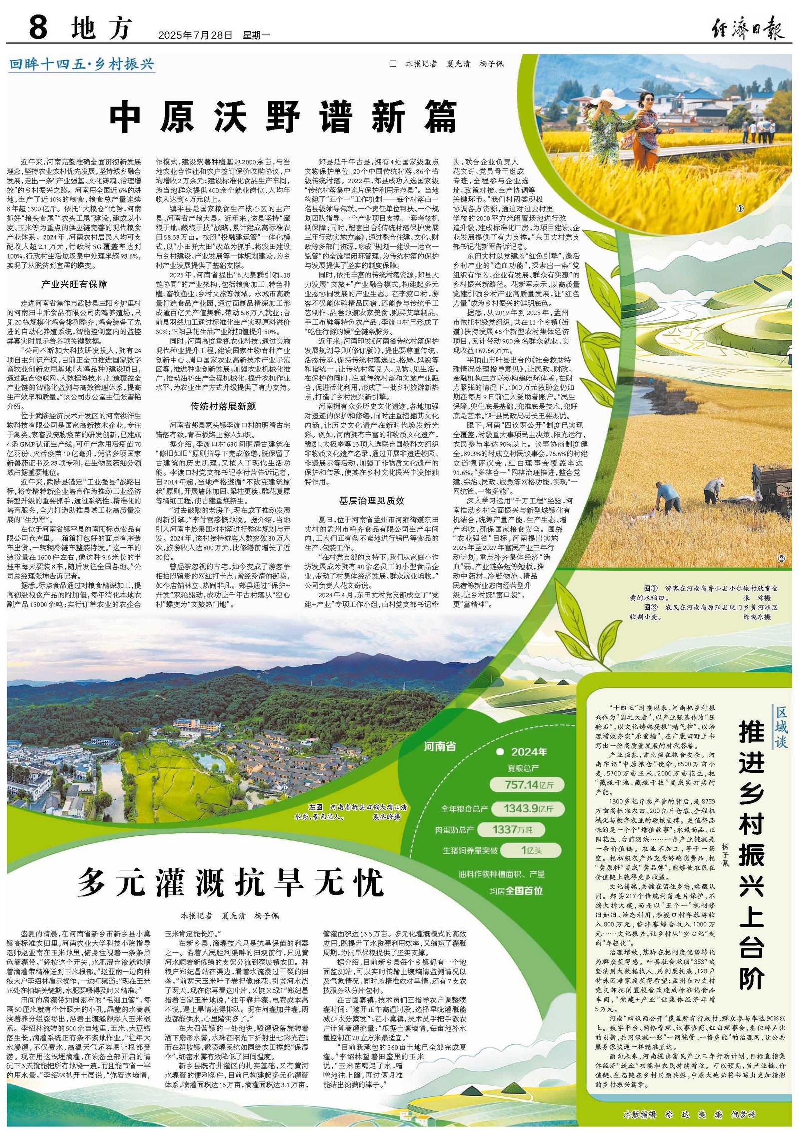 近年来,河南完整准确全面贯彻新发展理念,坚持农业农村优先发展,坚持城乡融合发展,走出一条“产业强基、文化铸魂、治理增效”的乡村振兴之路。河南用全国近6%的耕地,生产了近10%的粮食,粮食总产量连续8年超1300亿斤。依托“大粮仓”优势,河南抓好“粮头食尾”“农头工尾”建设,建成以小麦、玉米等为重点的供应链完善的现代粮食产业体系。2024年,河南农村居民人均可支配收入超2.1万元,行政村5G覆盖率达到100%,行政村生活垃圾集中处理率超98.6%,实现了从脱贫到宜居的蝶变。
