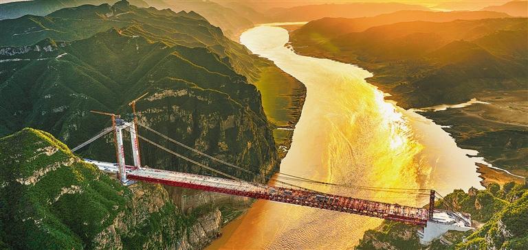 7月31日,河南省济新黄河大桥全桥贯通。该桥是世界首座地锚式回转缆悬索桥,是济新高速公路重点控制性工程,全长1688.5米,主跨555米。刘玉才摄(中经视觉)