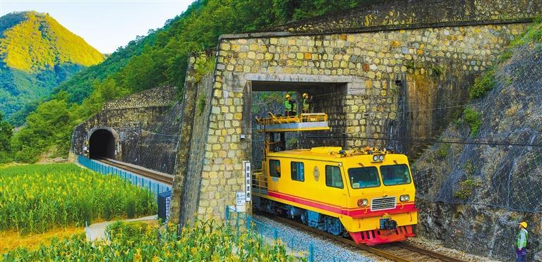 7月30日,陕西省汉中市略阳县宝成铁路线上,中国铁路西安局宝鸡供电段工人正在检修设备,保障暑运期间客货列车运行安全畅通。刘一江摄(中经视觉)