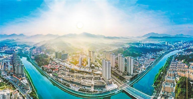 近年来,安徽省安庆市岳西县产业园区加速升级,在引入高新技术企业、创新团队,构建多元产业生态的同时,依托山水资源,打造景观步道、绿化公园等,营造宜居环境。图为岳西县天馨国际产业园与周边的楼宇、山峦、道路、河流。