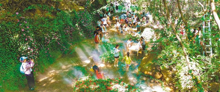 7月29日,河南省南阳市方城县,游客和市民在七峰山景区“十里花溪”戏水游玩。该县围绕“亲水”主题打造消费新场景,激活文旅新动能。王小军摄(中经视觉)