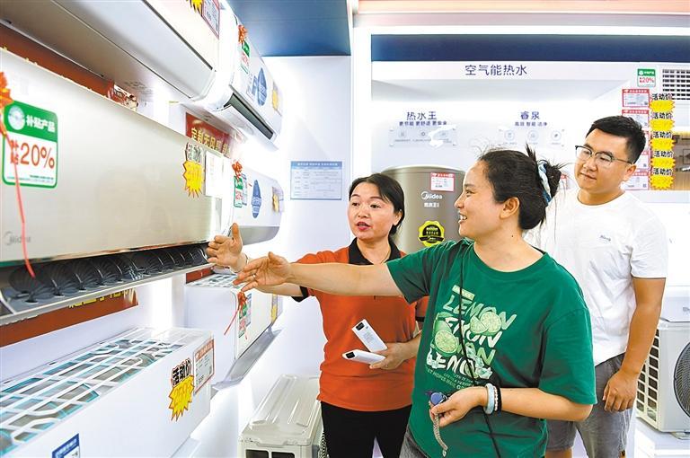 7月21日,江西省宜春市东湖社区,消费者在选购空调。该市“以旧换新”活动持续推进,今年已带动家电销售超31万件。