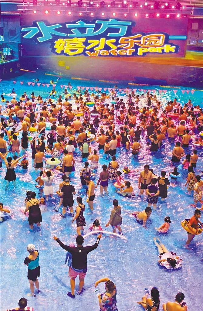 7月19日,市民在北京水立方嬉水乐园体验戏水乐趣。该乐园规模达1.2万平方米,多种多样的水上娱乐项目为游客提供夏日清凉新体验。廖祖平摄(中经视觉)