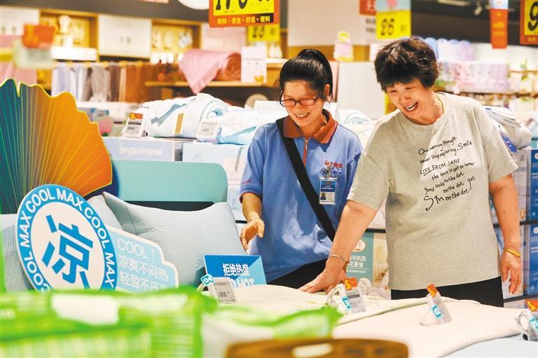 7月25日,浙江省嘉兴市南湖区一商场内,顾客在选购夏季床上用品。