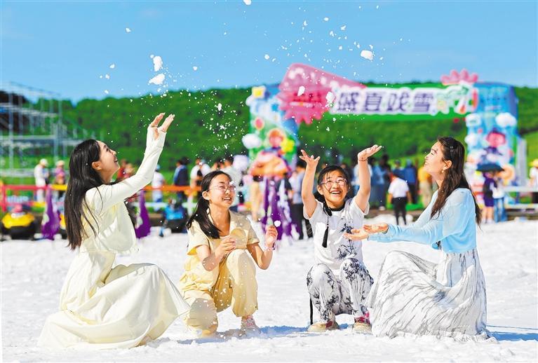 7月11日,游客在内蒙古牙克石市凤凰山景区戏雪。当地利用冬季储存的积雪打造了夏季滑雪、驾驶雪地摩托等趣味项目,吸引游客前来体验。