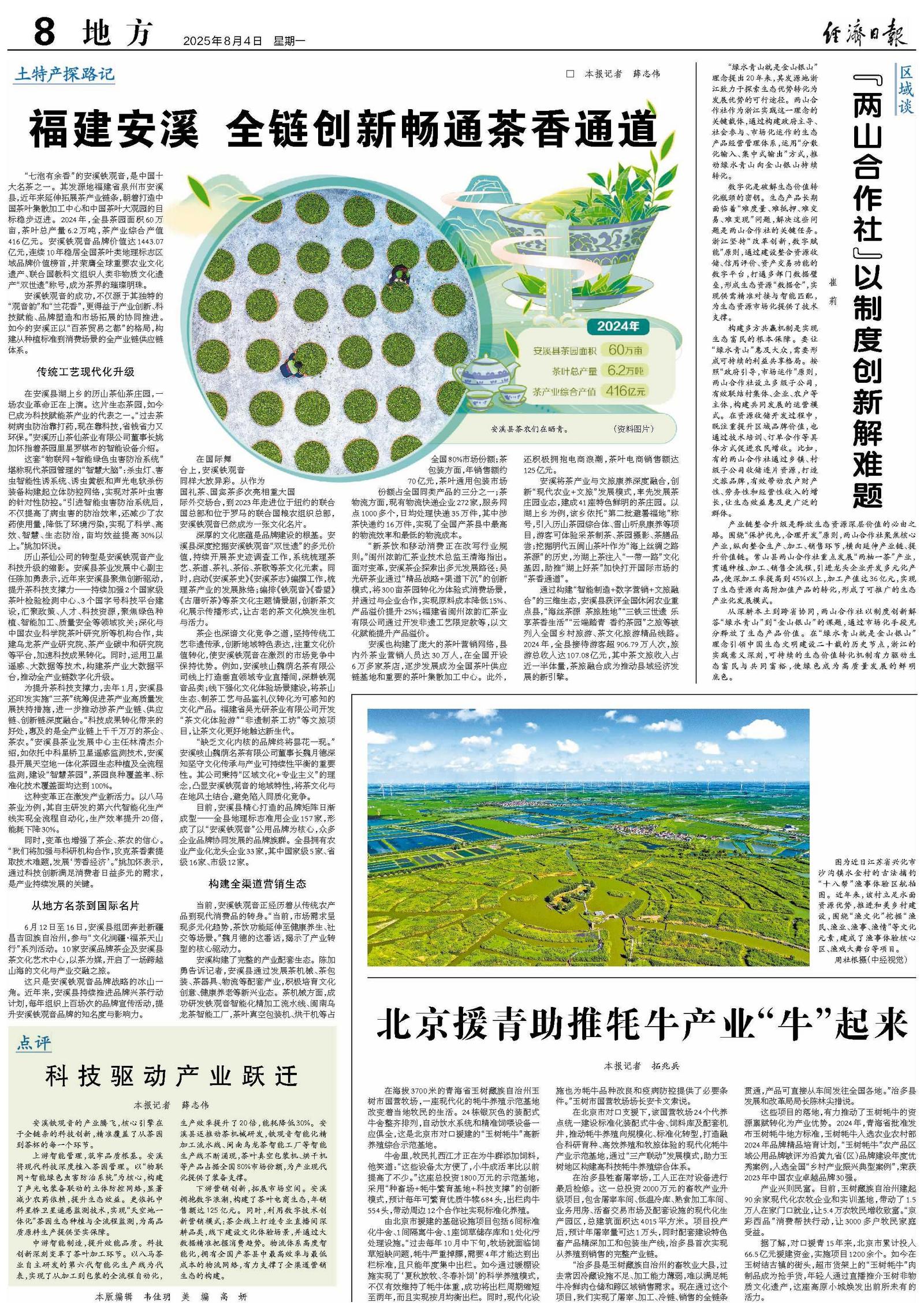“七泡有余香”的安溪铁观音,是中国十大名茶之一。其发源地福建省泉州市安溪县,近年来延伸拓展茶产业链条,朝着打造中国茶叶集散加工中心和中国茶叶大观园的目标稳步迈进。2024年,全县茶园面积60万亩,茶叶总产量6.2万吨,茶产业综合产值416亿元。安溪铁观音品牌价值达1443.07亿元,连续10年稳居全国茶叶类地理标志区域品牌价值榜首,并荣膺全球重要农业文化遗产、联合国教科文组织人类非物质文化遗产“双世遗”称号,成为茶界的璀璨明珠。
