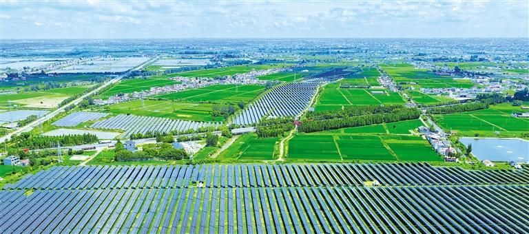 8月5日拍摄的江苏省海安市墩头镇一处“渔光互补”光伏电站。近年来,当地坚持生态优先理念,因地制宜发展“渔光互补”“农光互补”等光伏发电项目,促进经济、生态双丰收。