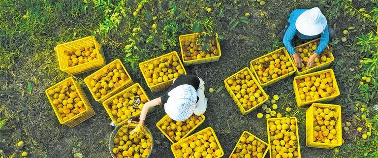 8月5日,重庆市黔江区太极镇新陆村村民在黄桃基地分拣黄桃。近年来,当地发展村集体经济,通过春赏花、夏采果的农旅融合,让黄桃成为农民增收的致富果。 杨 敏摄(中经视觉)