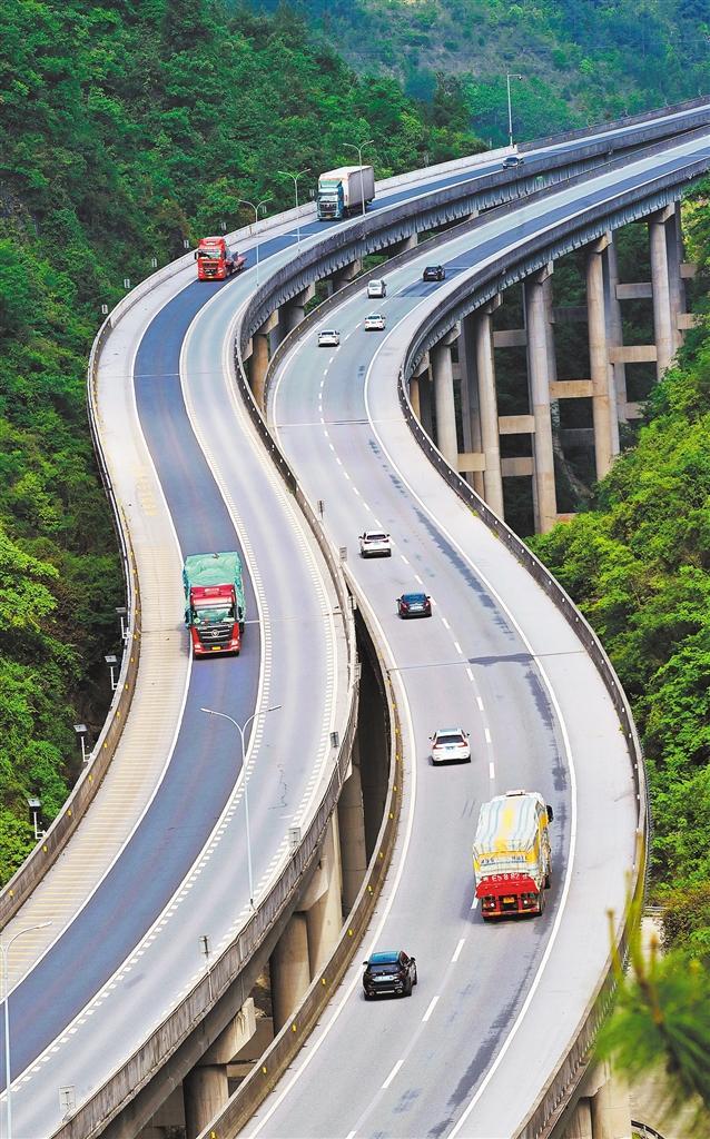 5月5日,车辆行驶在重庆市酉阳县渝湘高速酉阳板溪杉木洞大桥。目前,我国高速公路的通车里程已达19.1万公里,覆盖了99%的20万以上人口城市。陈碧生摄(中经视觉)