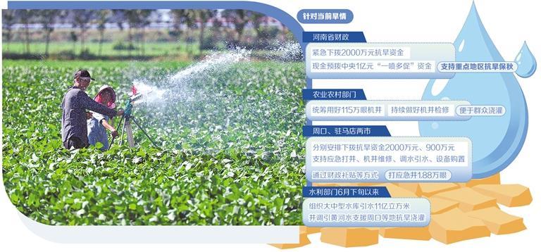 针对旱情,河南省农业农村厅、财政厅安排下达2000万元抗旱资金,现金预拨中央5000万元抗旱资金和1亿元“一喷多促”资金,支持重点地区抗旱保秋。农业农村部门统筹用好115万眼机井,持续做好机井检修,便于群众浇灌。水利部门组织水库开闸放水,累计调水9.49亿立方米。