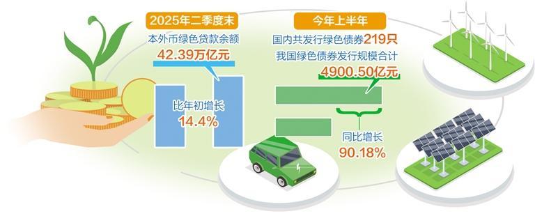 近日,中国人民银行发布2025年二季度金融机构贷款投向统计报告显示,我国绿色贷款增加较多。数据显示,2025年二季度末,本外币绿色贷款余额42.39万亿元,比年初增长14.4%,上半年增加5.35万亿元。