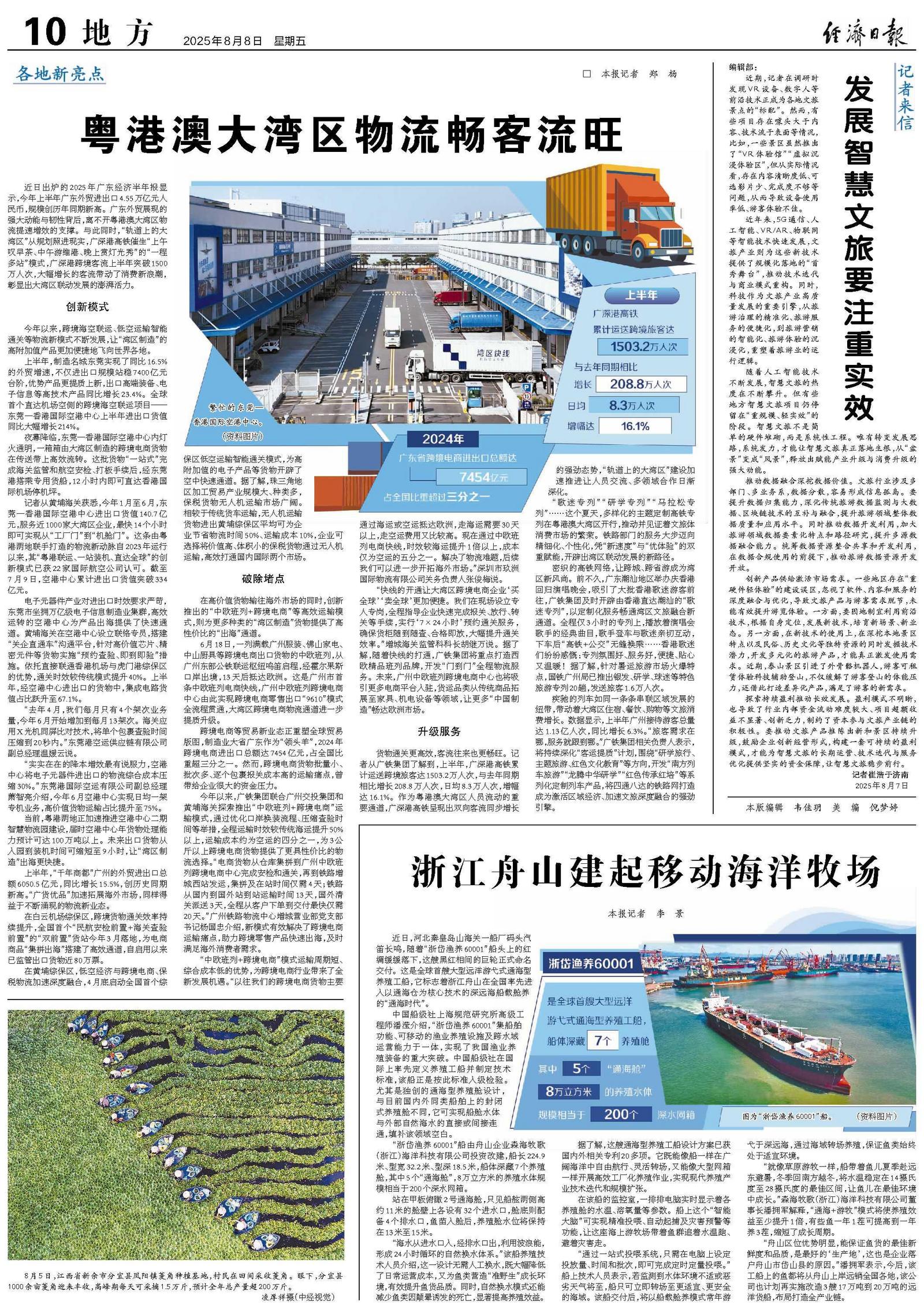 近日出炉的2025年广东经济半年报显示,今年上半年广东外贸进出口4.55万亿元人民币,规模创历年同期新高。广东外贸展现的强大动能与韧性背后,离不开粤港澳大湾区物流提速增效的支撑。与此同时,“轨道上的大湾区”从规划照进现实,广深港高铁催生“上午叹早茶、中午游维港、晚上赏灯光秀”的“一程多站”模式,广深港跨境客流上半年突破1500万人次,大幅增长的客流带动了消费新浪潮,彰显出大湾区联动发展的澎湃活力。