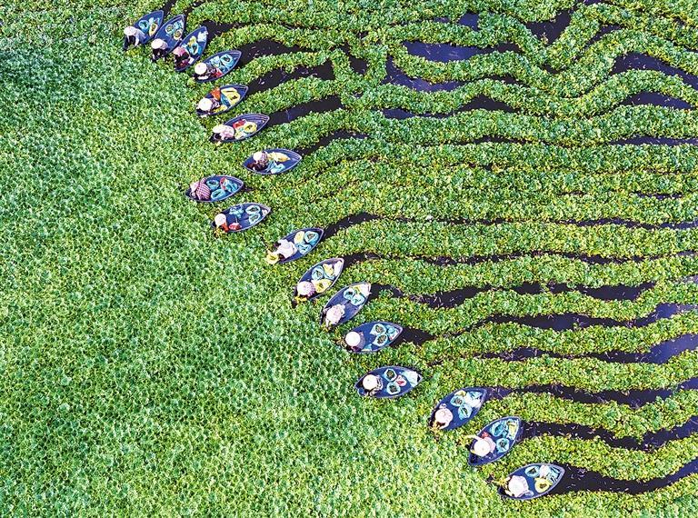 8月5日,江西省新余市分宜县凤阳镇菱角种植基地,村民在田间采收菱角。眼下,分宜县1000余亩菱角迎来丰收,高峰期每天可采摘1.5万斤,预计全年总产量超200万斤。