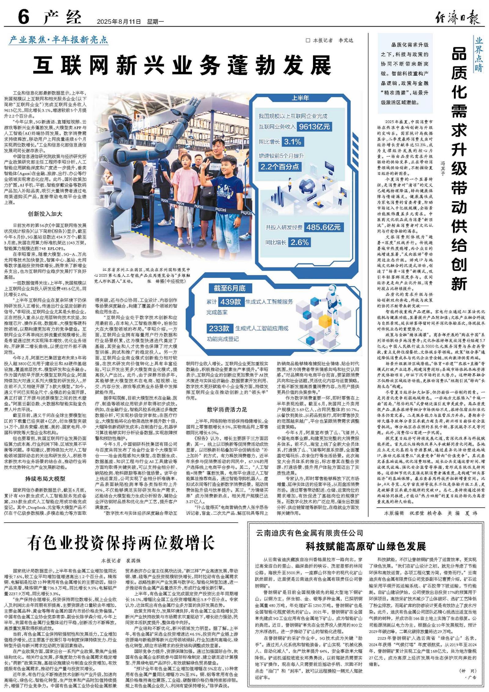 产业结构不断优化,新兴领域发力明显。据了解,上半年,有色金属矿采选业投资增速达46.5%,投资向产业链上游资源端与新能源等新兴应用领域倾斜,行业加速向高端化、绿色化转型,顺应市场需求的投资结构调整成效显著。