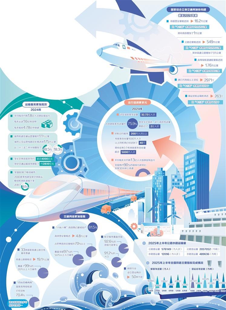 出行更便捷。交通部门大力推进智慧出行,线上售票、电子支付、刷脸出行得到广泛应用,“一次购票、一次支付、一票通行”加快实现。建制村基本实现了村村通客车、半数以上通了公交,说走就走成为现实。通勤方面,每天约有1亿人次乘坐轨道交通,1亿人次乘坐公交,1亿人次乘坐出租车和网约车。远途出行方面,2024年,动车组旅客发送量32.72亿人次,占铁路旅客发送量的75.9%;民航日均服务200万人次以上。此外,全国有约90%的县级行政中心实现30分钟上高速,平均每天大约有1.3亿人次选择自驾出行。